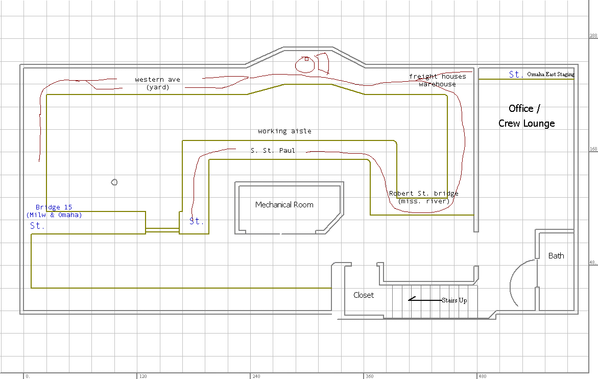 An example train will depart Minneapolis staging, heading clockwise around the plan. We pick this train up from the end of staging, by the entrance to the train room. We then head through the elevator district, over the duckunder bridge (at about 62"), and down Short Line Hill, and back along the long wall at the top of the drawing. We'll stop to work in the yard, just to the left of the bay windows, and then head out again, clockwise once more, and around the corner. This take us across the Robert St. bridge and into S. St. Paul, and Rock Island/CGW staging.